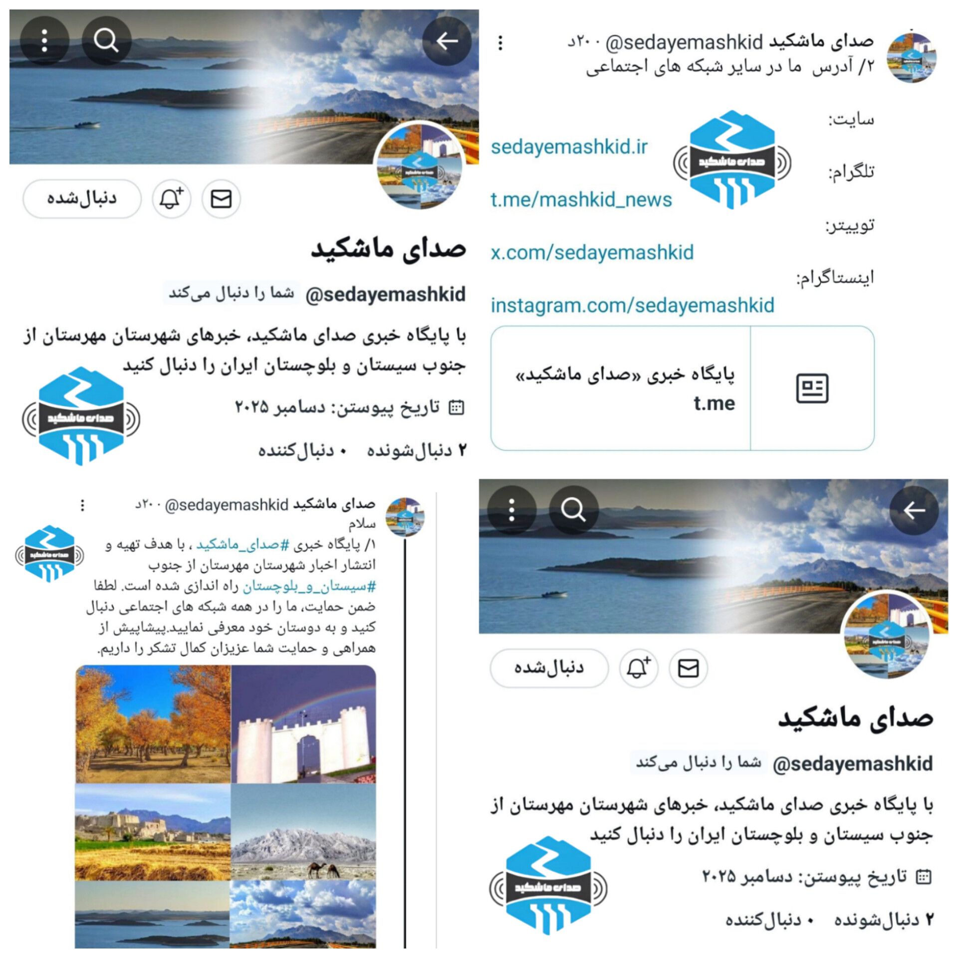 پایگاه خبری تحلیلی صدایماشکید با هدف تهیه، تولید و انتشار اخبار، گزارشها و مطالب تحلیلی شهرستان مهرستان در جنوب استان سیستان و بلوچستان، فعالیت رسمی رسانهای خود را در شبکه اجتماعی ایکس (X) آغاز کرد.